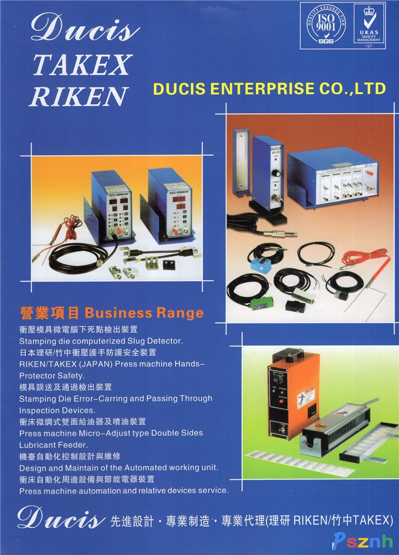 公司主要生產(chǎn)銷售微電腦下死點(diǎn)檢出器、模具誤送及通過(guò)檢出裝置、不銹鋼附自動(dòng)電磁閥給油桶,雙面給油器,噴油器,自動(dòng)化設(shè)備。代理之沖床護(hù)手防護(hù)安全裝置更是日本三大產(chǎn)品:理研光電產(chǎn)品、竹中之品牌、杉山之檢知器。
