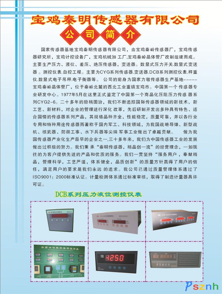 工廠,寶雞秦嶺晶體管廠改制組建而成.主要生產(chǎn)壓力.液位.差壓.絕壓傳感器,變送器。數(shù)顯式壓力開關(guān).數(shù)顯式變送器