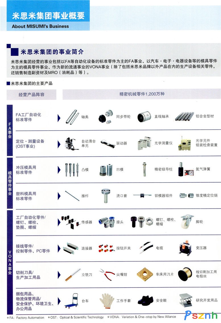 總公司株式會社MISUMI,自1963年于日本成立以來、一直堅持向客戶快速、準(zhǔn)確地提供FA工廠自動化用零件、模具零件、電子部品、工具•消耗品等各種高質(zhì)量的零件。通過獨(dú)自匯編產(chǎn)品目錄和建立直接銷售產(chǎn)品的營銷體制、創(chuàng)出了低成本的商務(wù)經(jīng)營模式、并通過依據(jù)客戶的意見和要求來制定每年的產(chǎn)品規(guī)劃、持續(xù)開發(fā)具備高質(zhì)量水平的MISUMI名牌產(chǎn)品。