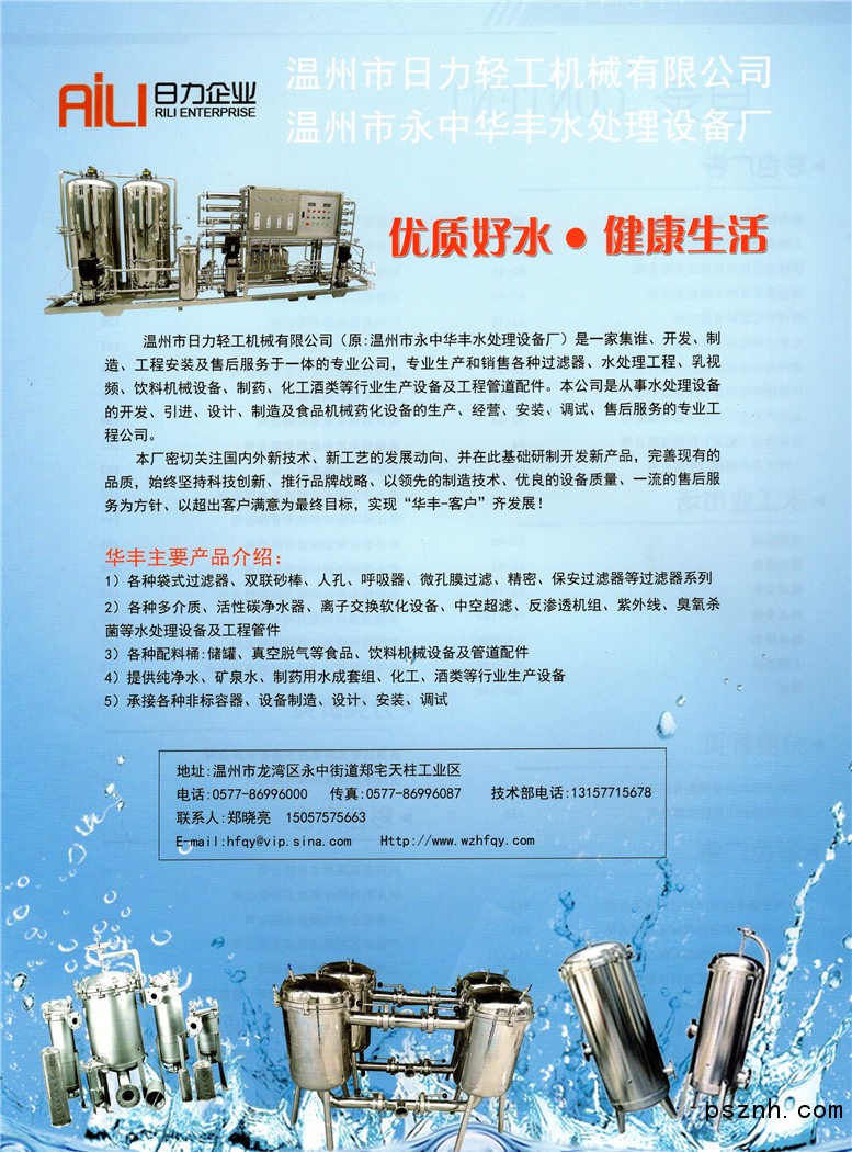 溫州市日力輕工機(jī)械有限公司_反滲透裝置及膜_ 超濾裝置及膜應(yīng)用_軟化與除鹽設(shè)備_紫外線殺菌器_臭氧殺菌裝置_變頻恒壓供水系統(tǒng) _過濾器_食品飲料機(jī)械設(shè)備_濾芯濾膜_純凈水_礦泉水成套設(shè)備_中空超濾設(shè)備