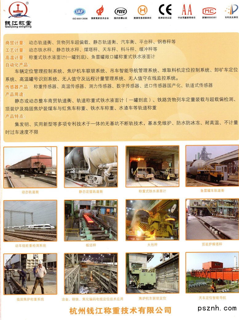 公司在整個生產(chǎn)與商務(wù)活動過程中,始終以“精心設(shè)計、精心制造”和“質(zhì)量是企業(yè)的生命”為宗旨,以此作為企業(yè)可持續(xù)發(fā)展和保證產(chǎn)品質(zhì)量的前提。公司的各類檢測設(shè)備和加工設(shè)備齊全,生產(chǎn)工藝穩(wěn)定,并且嚴(yán)格按照ISO9001:2008質(zhì)量管理體系運行,從而確保了產(chǎn)品質(zhì)量。1990年至今連續(xù)被杭州市工商局命名為《重合同、守信用》企業(yè)。 公司先后完成了多個國家級、省級、部級科研和開發(fā)項目,得到各級專家和用戶的高度評價。我們開發(fā)研制的國家火炬計劃:800t無基坑不斷軌復(fù)合式軌道稱重裝置、焦化企業(yè)焦?fàn)t四大車自動化控制管理成套設(shè)備,科技部星火計劃:800噸1/2全稱量軌道稱量系統(tǒng)的技術(shù)水平,領(lǐng)先于國內(nèi)外同類產(chǎn)品;車輛自動定位、自動行走等項目的技術(shù)水平,領(lǐng)先于國內(nèi)同類產(chǎn)品。