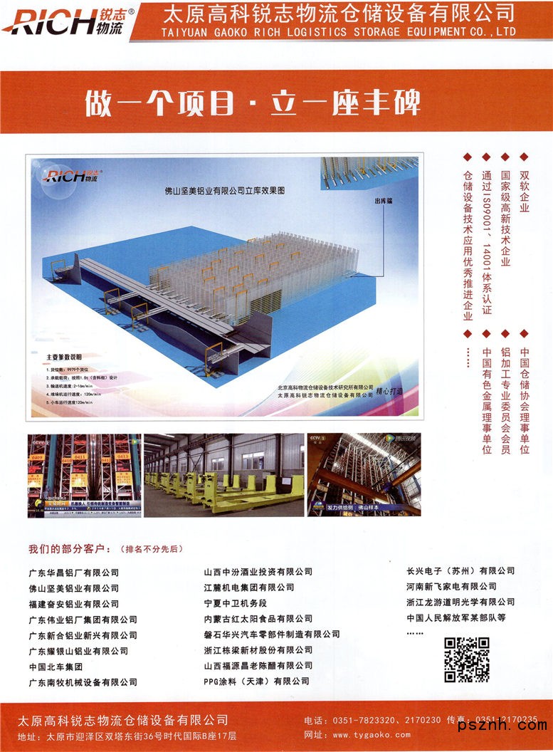 太原高科銳志物流倉(cāng)儲(chǔ)設(shè)備有限公司具有自主知識(shí)產(chǎn)權(quán)的“長(zhǎng)件鋁型材生產(chǎn)物流和自動(dòng)化立體倉(cāng)庫(kù)系統(tǒng)”、“鋁型材模具存取系統(tǒng)”已在鋁型材行業(yè)得到廣泛的應(yīng)用,并獨(dú)占該市場(chǎng)份額。