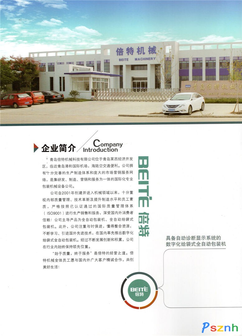 青島倍特機械科技有限公司(中韓合作)最早創(chuàng)建于2001年,位于青島萊西經(jīng)濟開發(fā)區(qū),臨近青島和國際機場,海陸空交通便利。公司主營數(shù)字化全自動給袋式包裝機。該新型包裝機主要應(yīng)用于食品,醫(yī)藥、洗化等領(lǐng)域中各種顆粒狀、粉狀、醬體物料的自動稱重與包裝。           自進入機械領(lǐng)域,公司十分重視內(nèi)部質(zhì)量管理、技術(shù)革新及提升制造水平和員工素質(zhì),嚴(yán)格按照已認(rèn)證通過的國際質(zhì)量管理體系(ISO9001)進行生產(chǎn)、銷售和服務(wù),深受國內(nèi)外消費者信賴!公司主導(dǎo)產(chǎn)品為全自動包裝機、全自動給袋式包裝機、旋轉(zhuǎn)給袋式包裝機。此外,公司注重與時俱進,懂得整合資源,不斷學(xué)習(xí),引進國外先進技術(shù),并與韓國優(yōu)秀機械企業(yè)建設(shè)技術(shù)合作關(guān)系。           經(jīng)過不斷發(fā)展創(chuàng)新與積累,公司在行業(yè)內(nèi)始終保持領(lǐng)先位置,先后被評為[促進經(jīng)濟建設(shè)先進單位]、[自營出口先進企業(yè)]、[誠信百佳企業(yè)]、[山東省明星企業(yè)]、[山東省高成長型民營企業(yè)]、[省文明單位]、[守合同 重信用單位]等榮譽稱號。           “盡最大努力為客戶創(chuàng)造額外價值”是倍特的經(jīng)營之道。倍特機械全體員工愿與國內(nèi)外廣大客戶精誠合作,共創(chuàng)美好生活!