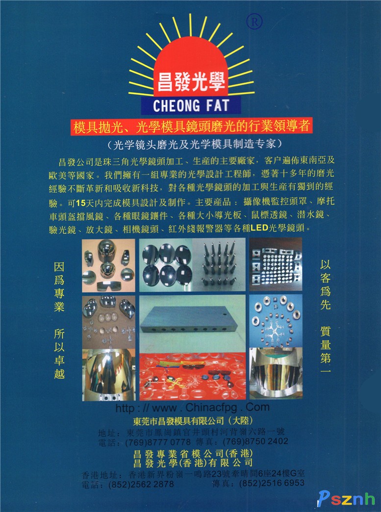 莞市昌發(fā)模具有限公司(大陸) 昌發(fā)專業(yè)省模公司(香港) 昌發(fā)光學(xué)(香港)有限公司        于1995年于香港註冊成立昌發(fā)專業(yè)省模公司,昌發(fā)光學(xué)(香港)有限公司,並在大陸註冊東莞市昌發(fā)模具有限公司,業(yè)務(wù)范圍:一、專業(yè)從事模具表面拋光;二、光學(xué)模具鏡頭磨光;三、光學(xué)模具設(shè)計與制造。通過二十年的努力、改革和創(chuàng)新,公司業(yè)務(wù)遍及全球,並擁有昌發(fā)省模和昌發(fā)光學(xué)兩個注冊品牌 ,一直是模具拋光行業(yè)的領(lǐng)導(dǎo)者。