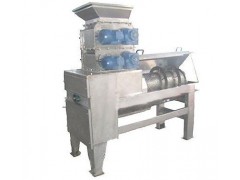本機為螺旋式擠榨,工作過程是:先將物料經(jīng)破碎輥裝置進行初破碎后,由輸送螺旋將進入進料箱的物料推向擠榨螺旋,通過擠榨螺旋的螺距減小和軸徑增大,并在篩筒壁和錐形體阻力的作用下,使物料所含的液體物料(如果汁)被擠壓出。擠出的液體從篩孔(物料不同孔徑不同)中流出,集中在接汁斗內。