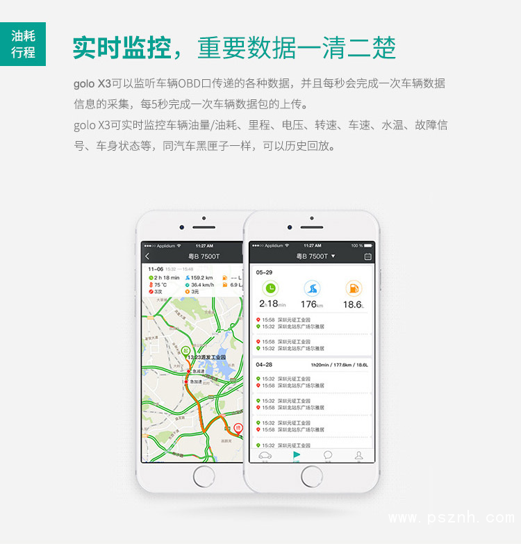 golo X3可實時監(jiān)控車輛油量/油耗、里程、電壓、轉(zhuǎn)速、車速、水溫、故障信號、車身狀態(tài)等,同汽車黑匣子一樣,可以歷史回放。