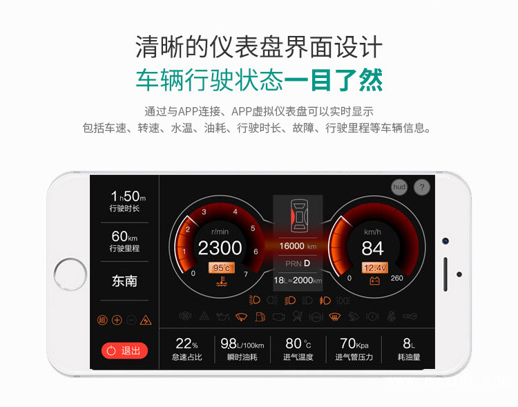 通過與APP連接、APP虛擬儀表盤可以實時顯示包括車速、轉(zhuǎn)速、水溫、油耗、行駛時長、故障、行駛里程等車輛信息。