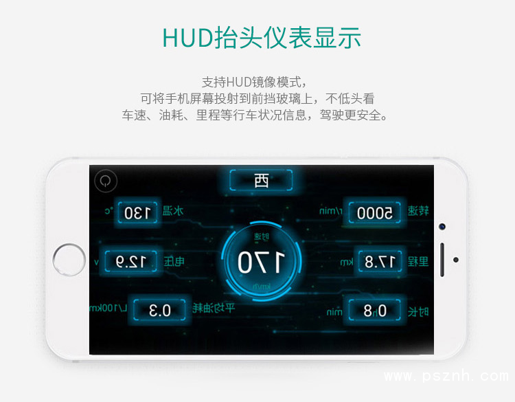 支持HUD鏡像模式,可將手機屏幕投射到前擋玻璃上,不低頭看車速、油耗、里程等行車狀況信息,駕駛更安全。