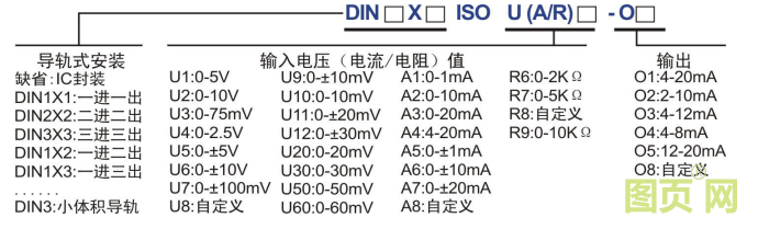 例 5: 信號輸入:0-10V; 信號輸出:4-8mA; 一進一出; 小體積導軌式安裝 產(chǎn)品型號: DIN 3 ISO U2-O4