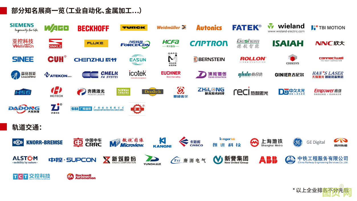 軌道交通展展:地鐵、輕軌和鐵路機(jī)車車輛及配件、內(nèi)飾;地鐵、輕軌和鐵路交通規(guī)劃及設(shè)計(jì);車輛制動(dòng)系統(tǒng)、傳動(dòng)系統(tǒng)、車門系統(tǒng)、照明系統(tǒng)、自動(dòng)駕駛系統(tǒng)、其他系統(tǒng);軌道交通供電系統(tǒng);鐵路投資及軌道運(yùn)營(yíng)單位;隧道及地下工程施工技術(shù)及設(shè)備,建設(shè)工程材料、防水材料;信息和自動(dòng)化技術(shù)、通信信號(hào)技術(shù)的應(yīng)用;原材料及其他工具類;車站運(yùn)營(yíng)維保服務(wù)及配套設(shè)施;軌道安防技術(shù)及設(shè)備;檢測(cè)儀器與技術(shù)認(rèn)證;軌交監(jiān)控、人工智能;五金工具;基礎(chǔ)設(shè)施建設(shè)及配套