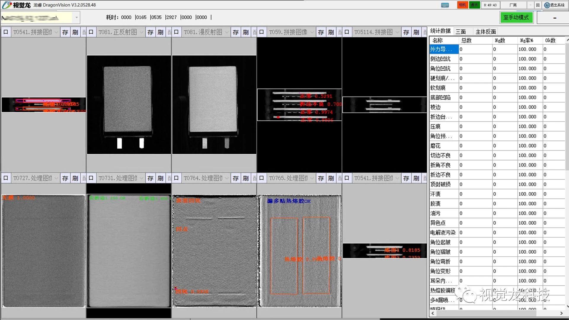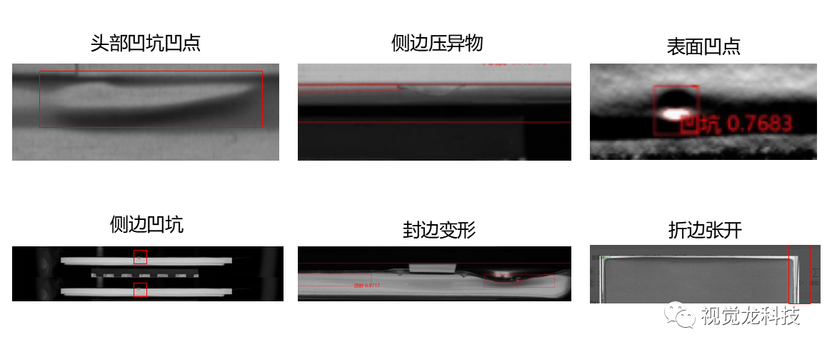 本項(xiàng)目檢測(cè)電芯外觀52種缺陷類型,120多種缺陷項(xiàng)。包含凸點(diǎn)、切邊不良、主體變形、角位變形、破損、脹氣、腐蝕、漏液、異色點(diǎn)、異物、鋁塑膜黑線、電解液、劃傷、極耳短路、頂封短路、極耳黑線、極耳斷裂、極片翻折、鋁箔翻折等缺陷。致命不良(零漏檢)缺陷包含破損、脹氣、切邊不良、角位變形、極耳短路、主體變形、極片翻折、雙極耳、無極耳膠、邊電壓刺破、封印封斜、封印壓異物、封印起皺、壓極耳、脹氣、主體內(nèi)異物等。