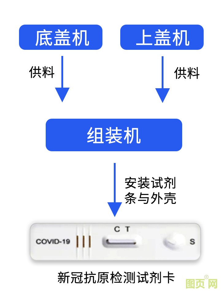 抗原檢測試劑卡分為三部分:上蓋、底蓋、試劑條,所以抗原檢測試劑卡生產(chǎn)設(shè)備由上蓋機(jī)、底蓋機(jī)、組裝機(jī)三部分組成