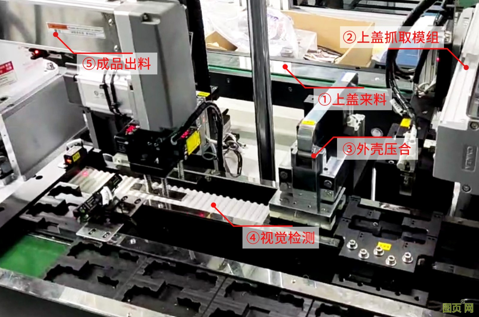 上蓋機(jī)和底蓋機(jī)負(fù)責(zé)給組裝機(jī)供料,組裝機(jī)安放好試劑條后把外殼進(jìn)行壓合組裝,一個完整的抗原檢測試劑卡就組裝完畢。