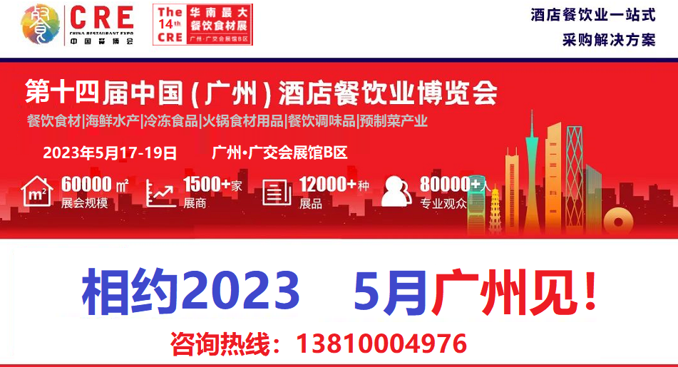 搶占新商機(jī),布局新規(guī)劃,采購新產(chǎn)品,前瞻新趨勢(shì),優(yōu)享新體驗(yàn),就在2023年5月17日-19日廣州·廣交會(huì)展館B區(qū),2023第十四屆中國(廣州)酒店餐飲業(yè)博覽會(huì)!2023餐飲業(yè)年度盛會(huì),歡迎您的報(bào)名參與!