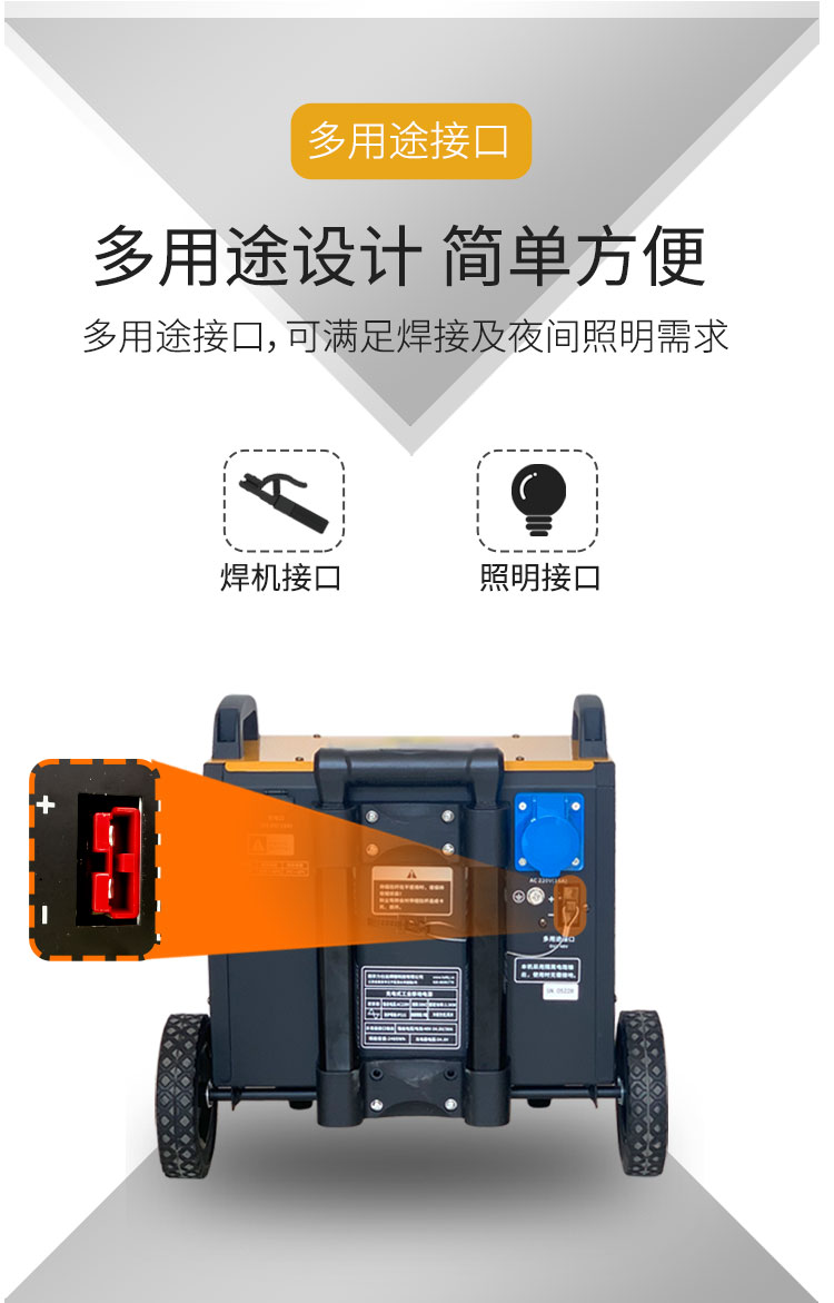 220V/3500W大功率電源,輸出穩(wěn)定,用于電鎬、切割機(jī)、角磨機(jī)等電動(dòng)工具現(xiàn)場(chǎng)供電;