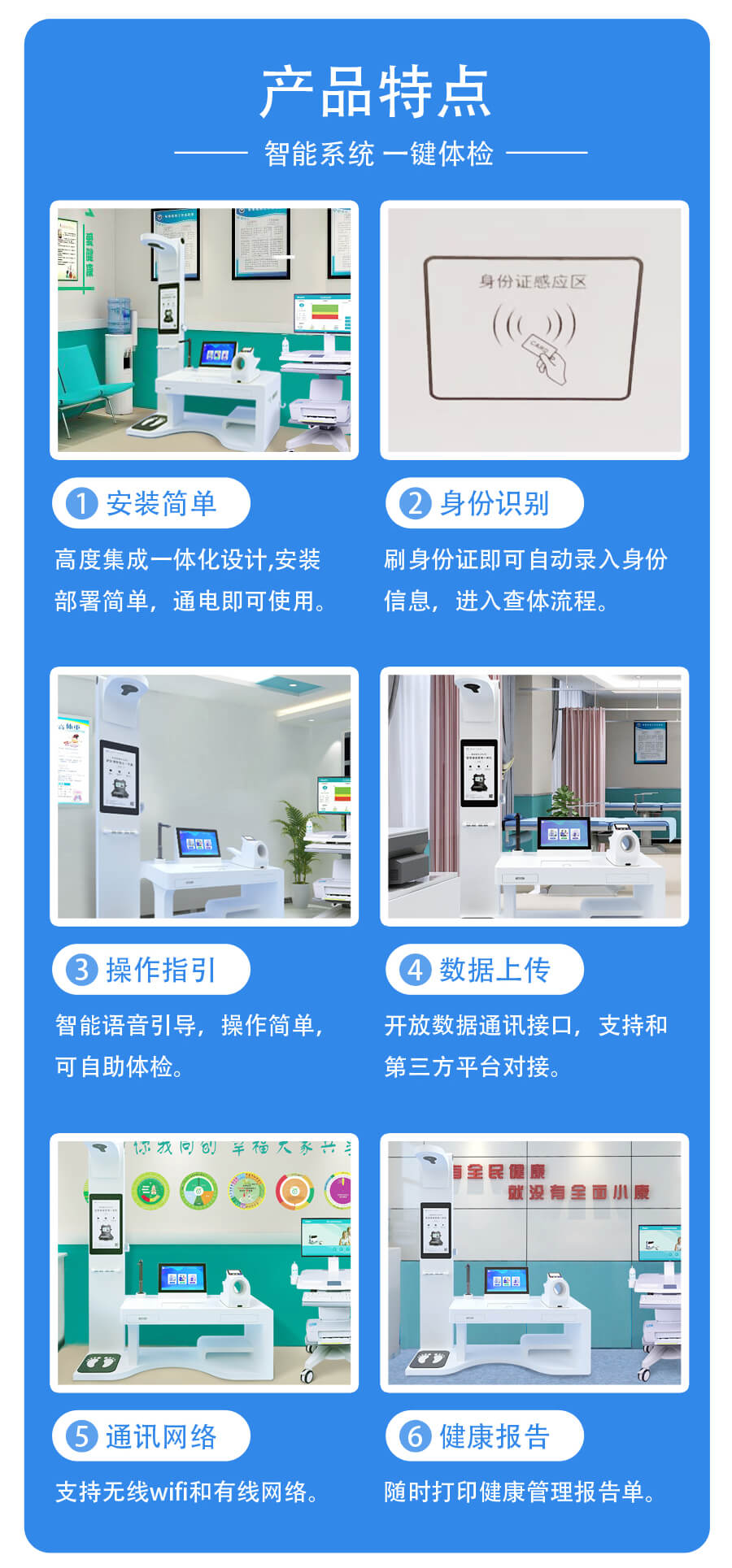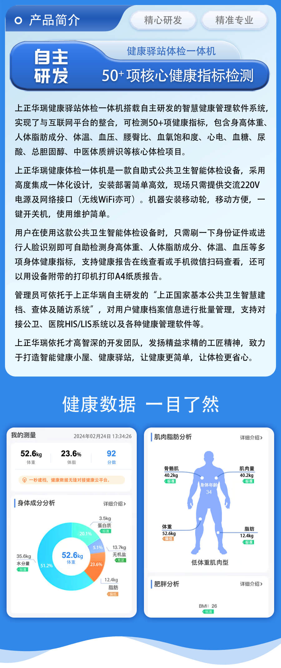 再者,上正華瑞大型健康體檢機可以自動上傳測量結(jié)果,生成科學(xué)的健康報告。其內(nèi)存儲量高,支持?jǐn)?shù)據(jù)共享,能夠?qū)訃夜l(wèi)管理系統(tǒng)、醫(yī)院HIS/LIS系統(tǒng)等醫(yī)療平臺,方便管理測量者的健康數(shù)據(jù),簡化數(shù)據(jù)傳輸與管理流程,提高人工工作效率。此外,這些健康數(shù)據(jù)還可以對接到當(dāng)?shù)蒯t(yī)療衛(wèi)生機構(gòu),實現(xiàn)實時監(jiān)控與風(fēng)險預(yù)警,有助于提升基層醫(yī)療機構(gòu)健康服務(wù)水平,改善基層醫(yī)療服務(wù)條件。
