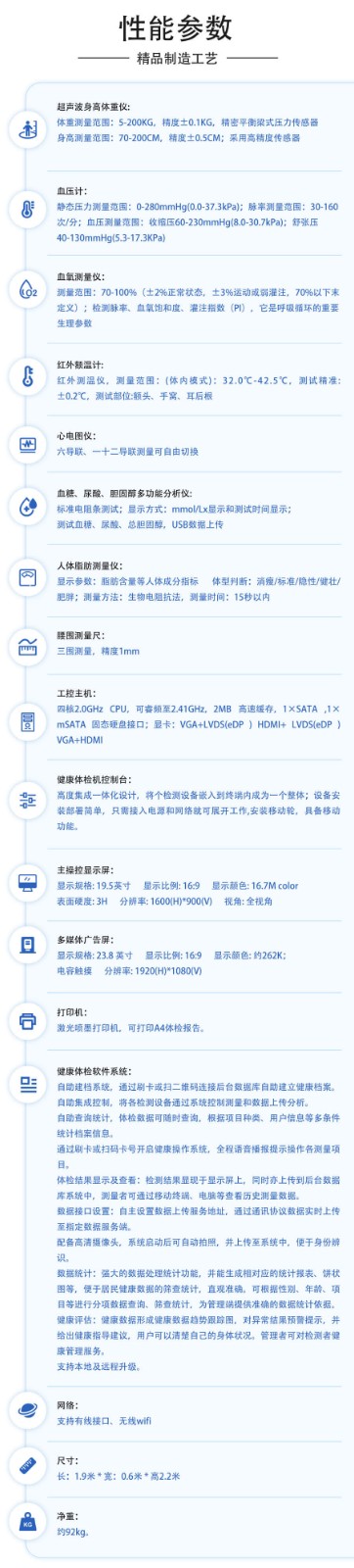 1、早期發(fā)現(xiàn)潛在疾病:上正華瑞臺式健康一體機集成了多種檢測功能,如血壓、血糖、心電圖等,能夠全面、快速地檢測居民的基本健康狀況。通過定期使用這種設備進行體檢,可以及早發(fā)現(xiàn)潛在的健康問題或疾病征兆,為居民提供及時的治療或干預,防止病情惡化。