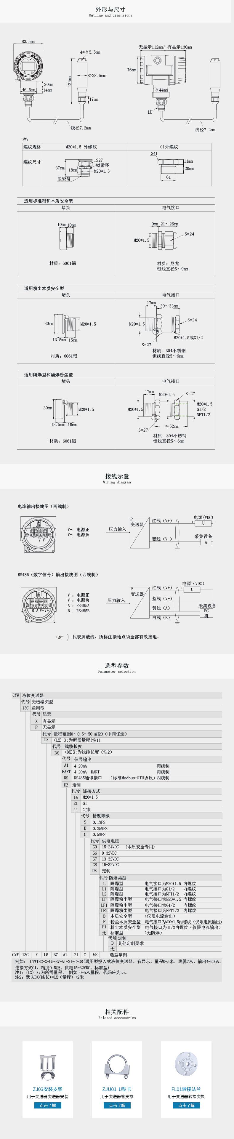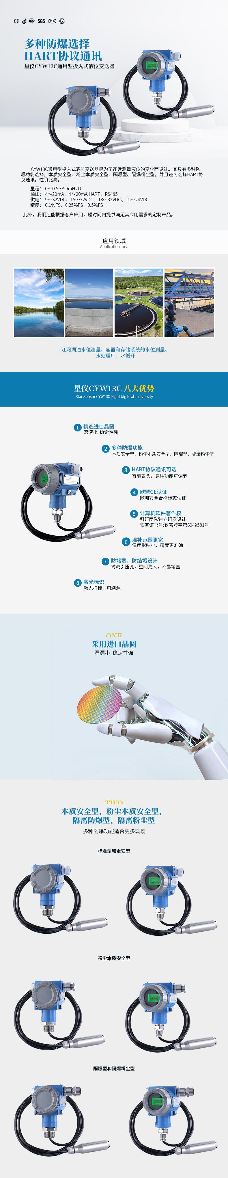 CYW13C通用型投入式液位變送器是為了連續(xù)測量液位的變化而設(shè)計。其具有多種防爆功能選擇,本質(zhì)安全型、粉塵本質(zhì)